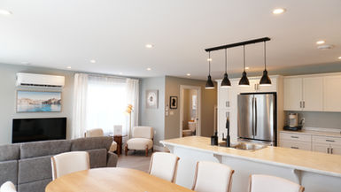 The open-concept living room is an oasis of calm, featuring a grey sofa adorned with ivory and beige pillows, complemented by a light grey rug that enhances the airy, welcoming ambiance. The dining area showcases a natural mango wood table paired with beige chairs, offering an intimate and cozy space for meals and gatherings. The kitchen is equipped with stainless steel appliances and fully stocked cabinets, making it easy to prepare meals and entertain loved ones. Every detail has been thoughtfully curated to ensure your stay is as comfortable and convenient as possible.